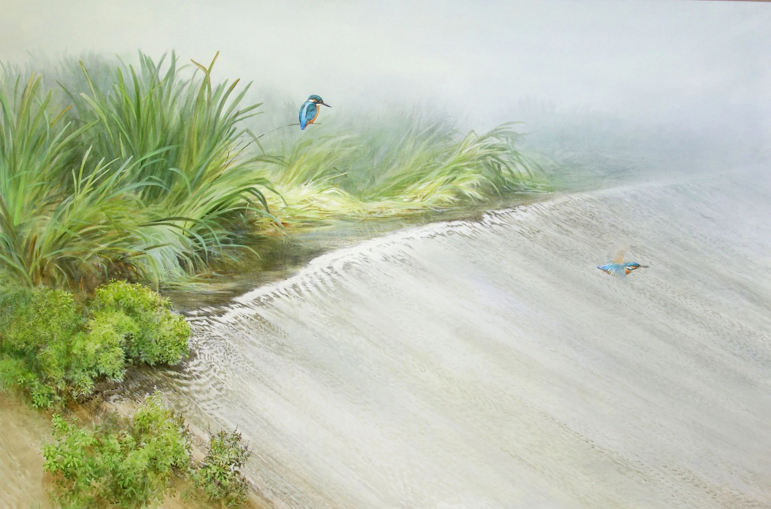 Kingfisher and weir,2007. Charcoal and watercolour on panel - 122 x 182 cm / 48 x 72 inches